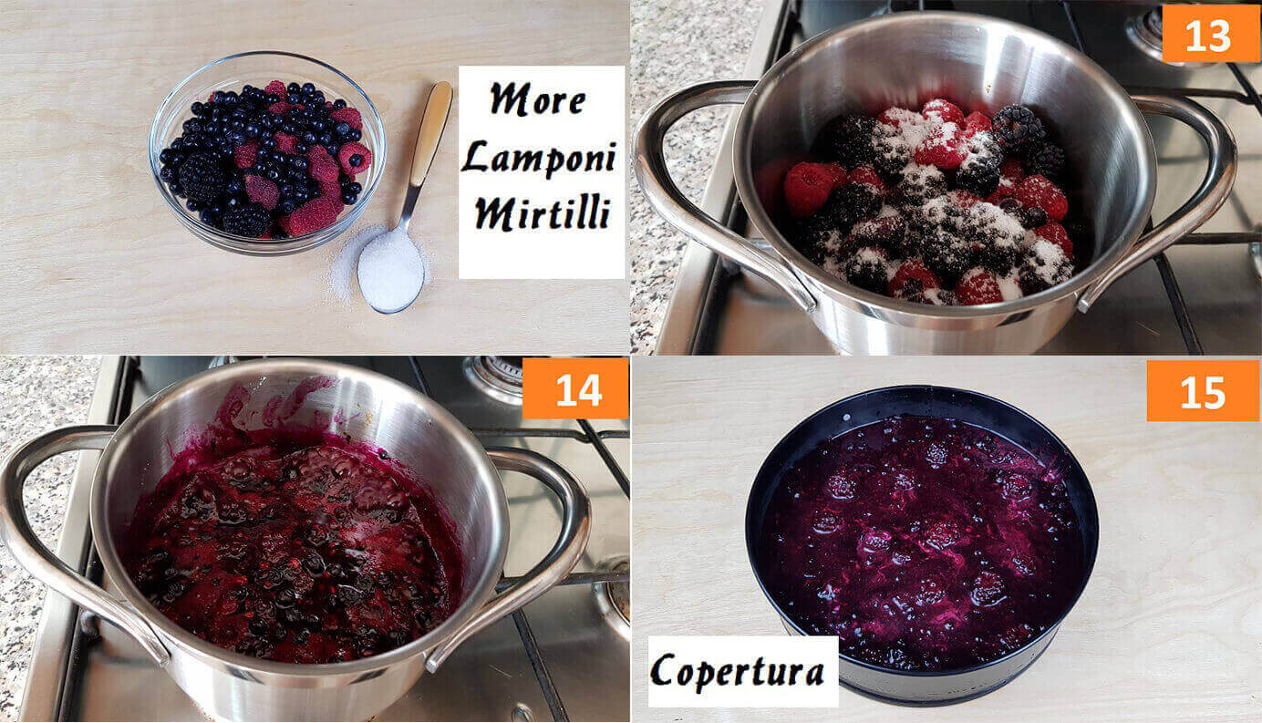 Passaggi 13 / 15 ) Preparate ora la marmellata ai frutti di bosco. In un tegame versate i frutti di bosco, aggiungete un cucchiaio di zucchero e fate cuocere per 10 minuti circa a fiamma dolce mescolando di tanto in tanto. Una volta pronta lasciate raffreddare, quindi riprendete il cheesecake e guarnitelo con la marmellata ai frutti di bosco, livellate bene. Mettete in frigo per almeno altri 30 minuti.