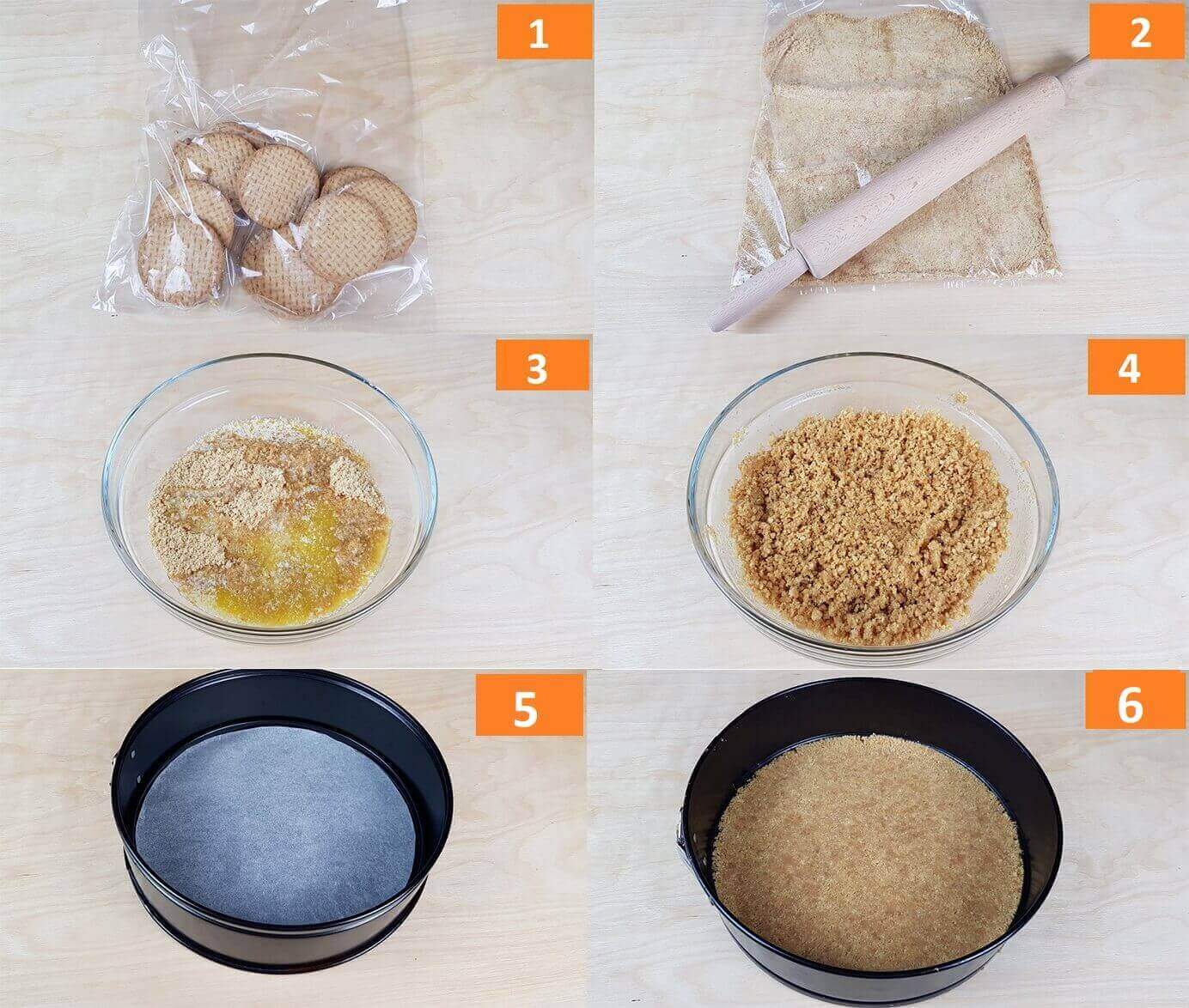Passaggi 1 / 6) La prima cosa da fare per preparare la cheesecake ai frutti di bosco è sbriciolare i biscotti per la base, metteteli in un sacchetto per alimenti e con un mattarello sminuzzateli, oppure usate un mix per frullarli. Sciogliete il burro, quindi incorporatelo ai biscotti fino ad ottenere un composto omogeneo. Foderate uno stampo a cerniera con carta forno e versateci dentro il composto, quindi compattatelo e livellatelo fino ad ottenere una base uniforme. Mettete in frigo a riposare per 30 minuti.