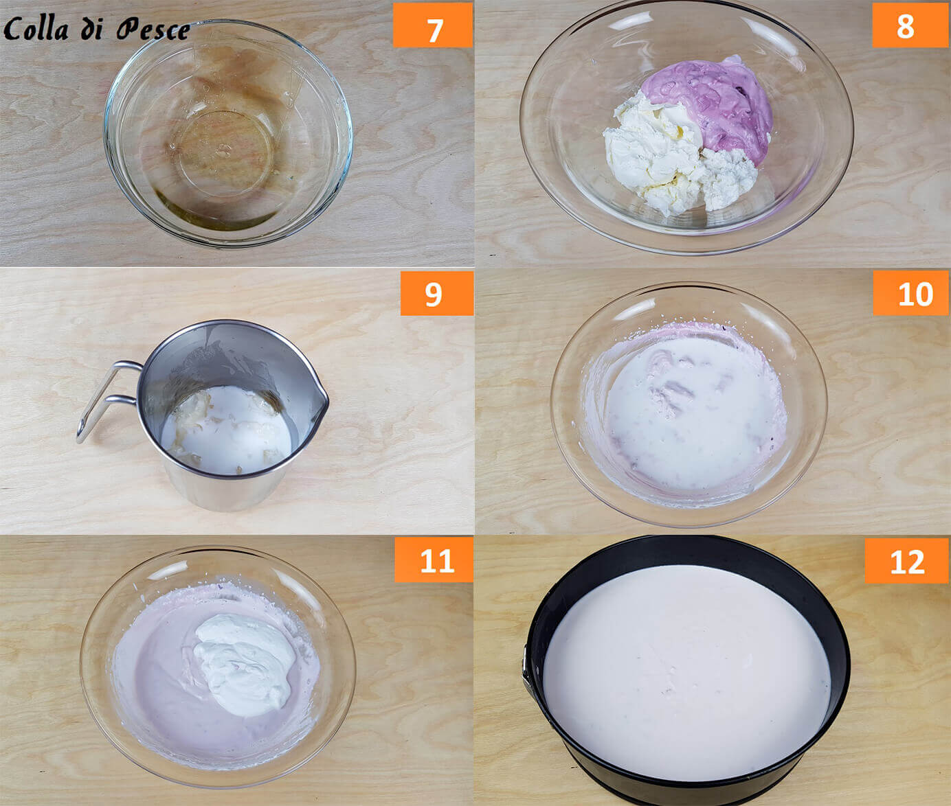 Passaggio 6 / 12) Nel frattempo preparate la farcitura. Mettete ad ammorbidire i fogli di colla di pesce in acqua fredda. Dopodichè in una ciotola capiente versate la ricotta, la philadelphia, lo yogurt ai frutti di bosco e lavorateli con le fruste fino ad ottenere una crema liscia. Riscaldate un pò di panna da dolci in un pentolino. Strizzate la gelatina e scioglietela nella panna, quindi incorporatela alla farcitura. Aggiungete ora la panna montata alla crema di formaggi, mescolate con movimenti dal basso verso l’alto per non smontare il composto. Riprendete la base dal frigo e versateci il composto. Mettete la cheesecake in frigo a riposare almeno 4 ore.