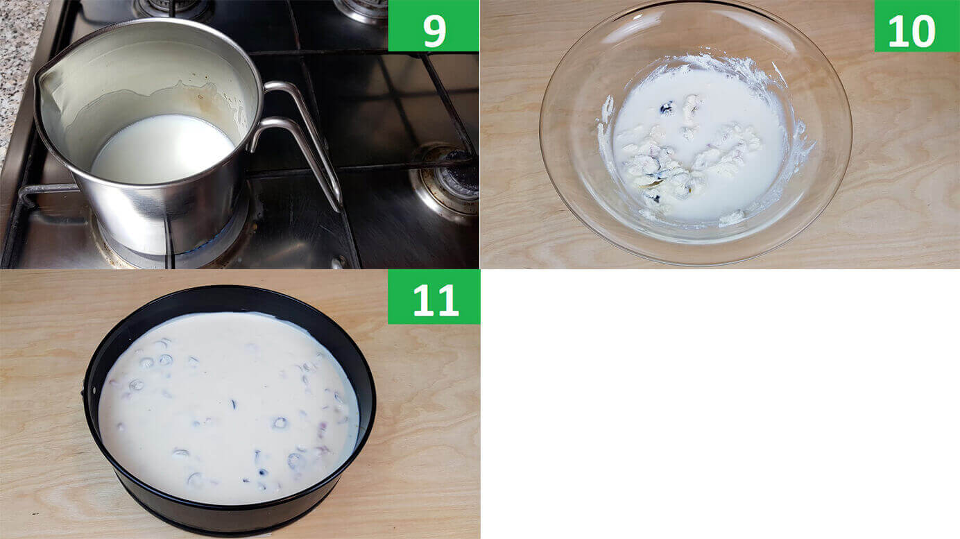 Passaggi 9 / 11 ) Mettete i fogli di gelatina ad ammorbidirsi in acqua fredda e contemporaneamente scaldate sul fuoco il latte. Quando la gelatina si è ammorbidita strizzatela dall’acqua e unitela al latte caldo. Mescolate per bene in modo che si sciolga la gelatina. Unite il latte alla crema di formaggi. Versate la crema di formaggi ottenuta nella tortiera sulla base di cracker.