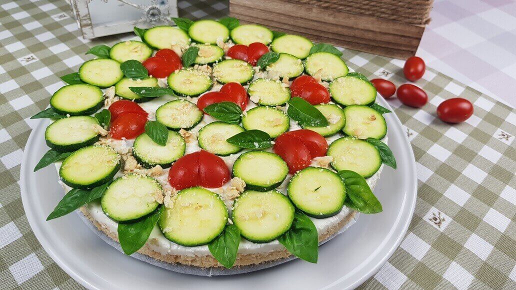 La Cheesecake è un piatto solitamente dolce e tipico Americano composta da una base di biscotto. Oggi la voglio preparare salata, con ingredienti freschi e sani che abbiamo solitamente nel nostro frigorifero. Ho utilizzato della Philadelphia fresca, Ricotta, craker, zucchine, prosciutto cotto a dadini e per aggiungere dei colori ho unito le olive verdi e nere. Per finire l’ho decorata con dei pomodorini freschi di stagione tagliati a forma di cuore e del basilico profumato.