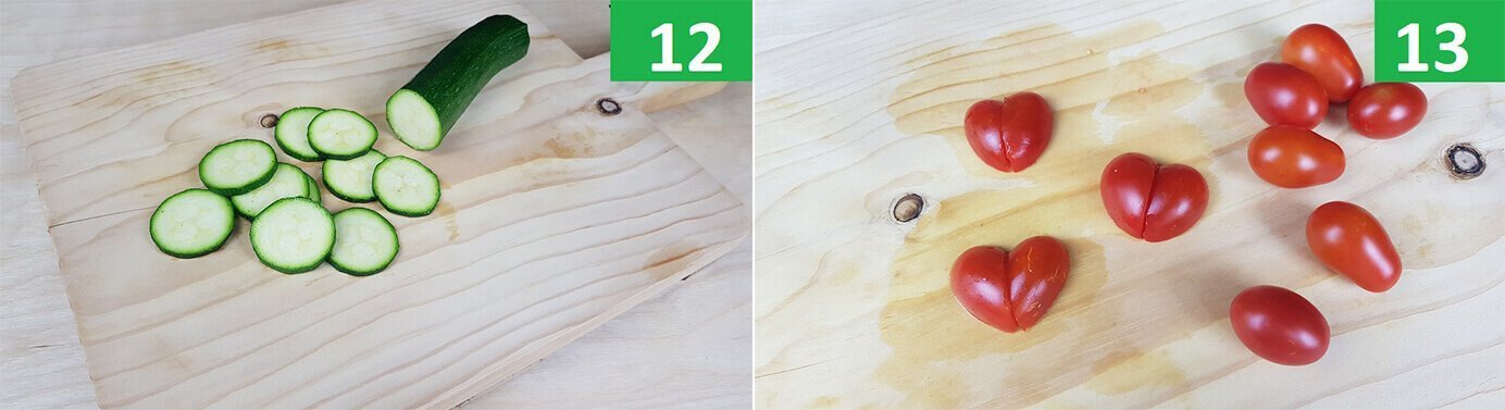 Passaggi 12 / 13 ) Tagliate le zucchine a rondelle sottili. Quando la cheesecake è pronta tiratela fuori dal frigo, posizionate le zucchine. Tagliate i pomodorini a forma di cuore per decorare e dare colore, qualche foglia di basilico e sbriciolate un cracker sulla superfice per dare ulteriore croccantezza.