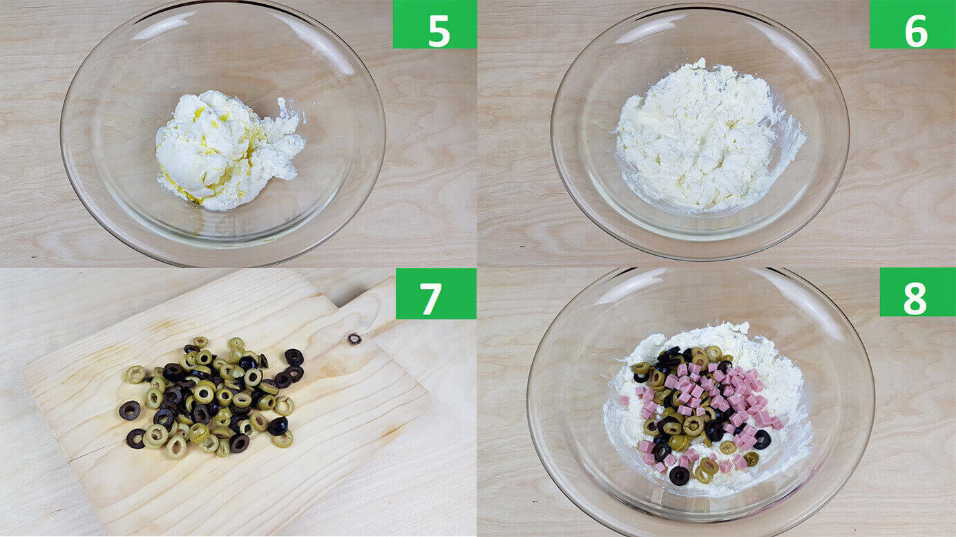 Passaggio 5 / 8) In una ciotola capiente mettete la ricotta e la Philadelphia, condite con olio extra vergine di oliva e sale. Con i rebbi di una forchetta schiacciate i formaggi in modo che si ammorbidiscano. Nel frattempo tagliate a rondelle le olive e unite al composto, aggiungete il prosciutto cotto a cubetti, mescolate e lasciate da parte.
