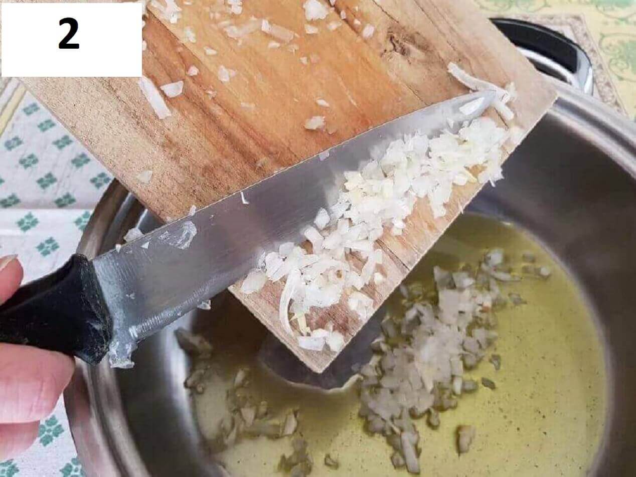 Passaggi 3 / 4) In una padella mettete scaldare l’olio, aggiungete la cipolla, e fate soffriggere.