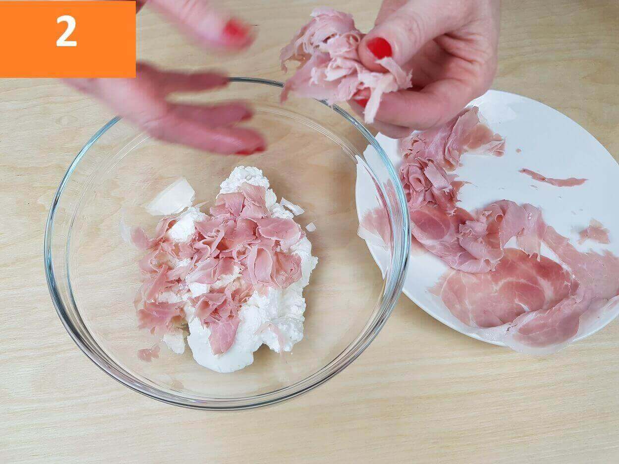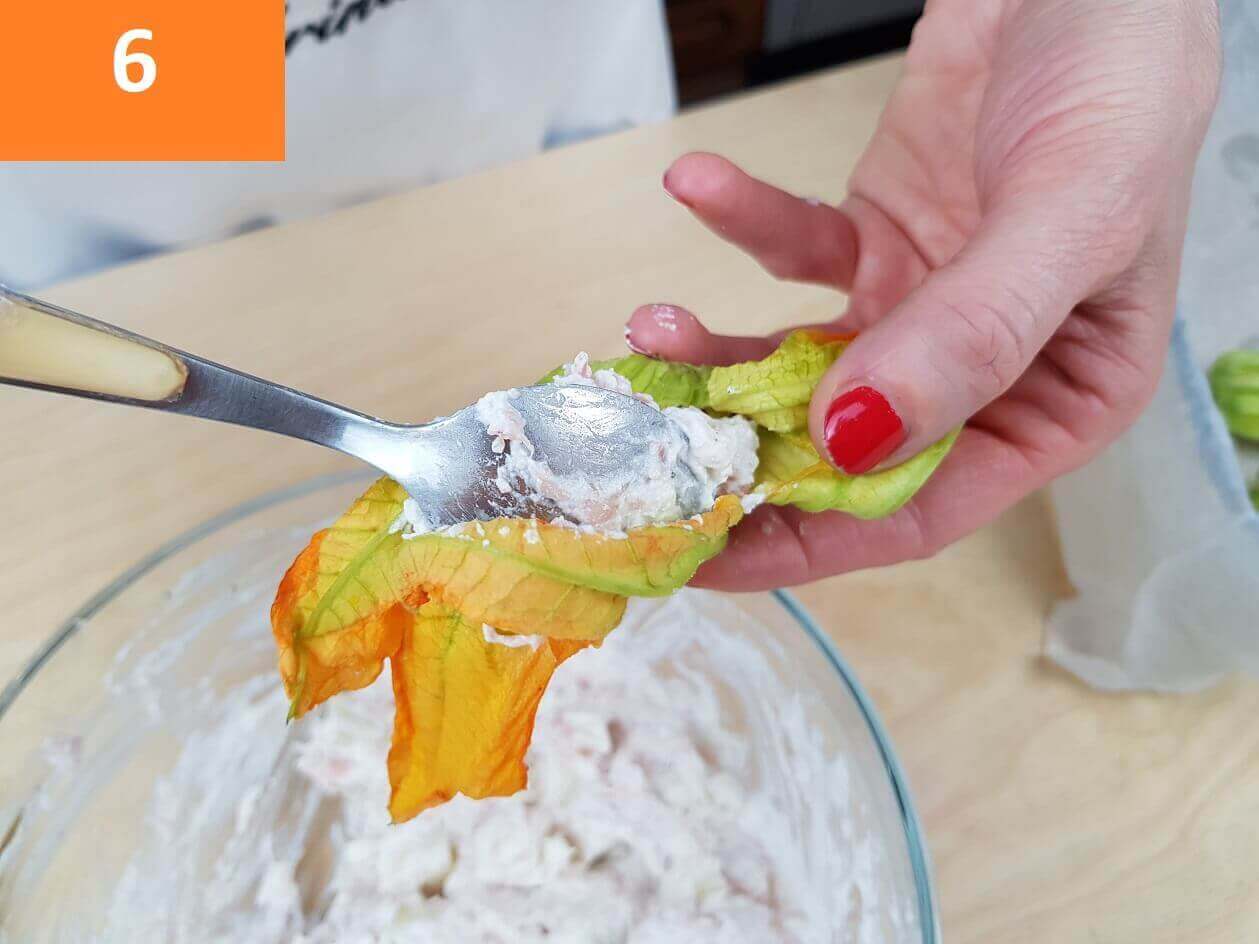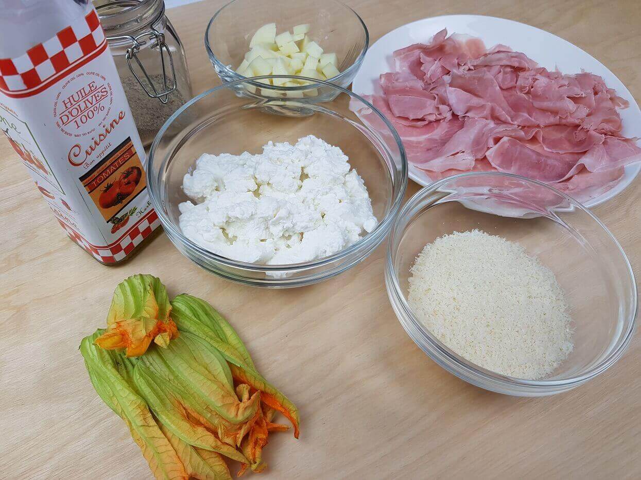 Passaggi 1 / 2 / 3) Per preparare i fiori di zucca ripieni procedete con la pulizia dei fiori. Pulite i fiori di zucca tamponandoli con un panno umido. Aprite i fiori di zucca ed estraete il pistillo centrale. Fatto questo preparate il ripieno riunite in una terrina la ricotta, il prosciutto a pezzetti e la scamorza tagliata a cubetti molto piccoli.