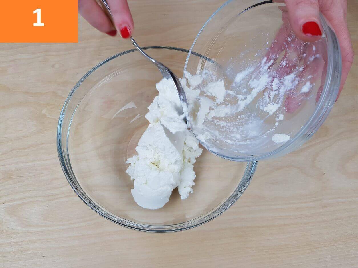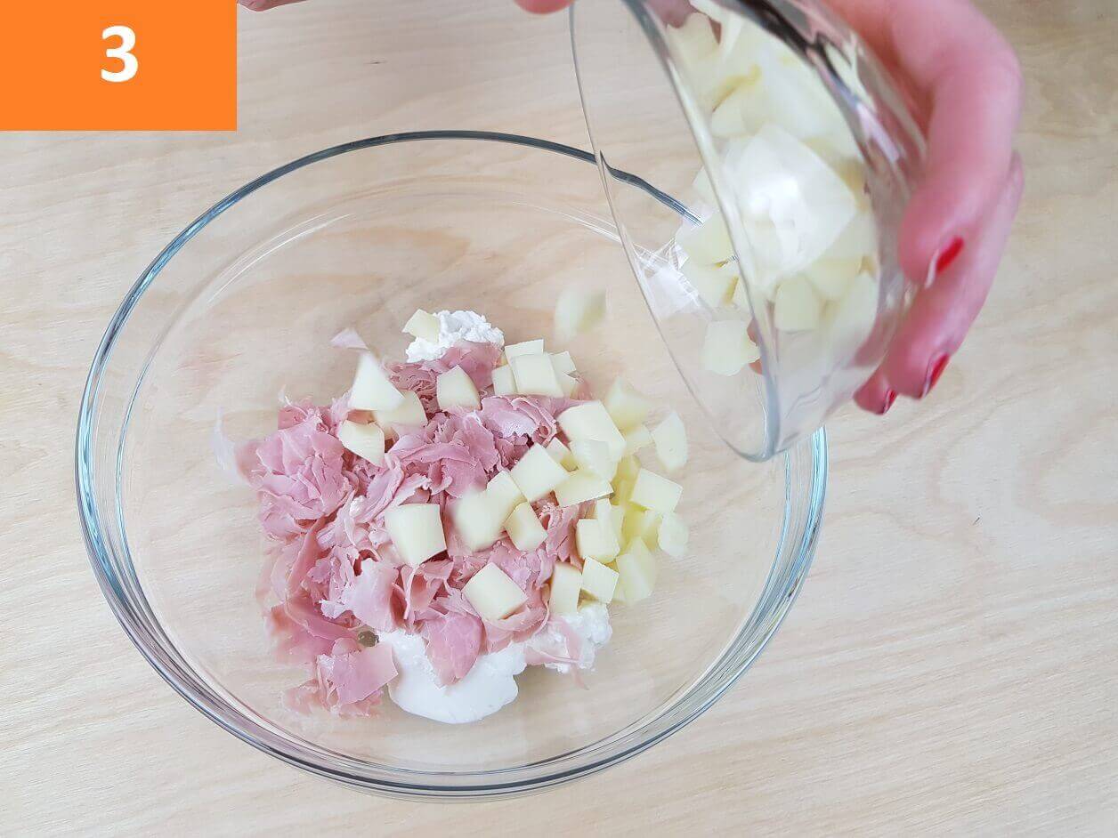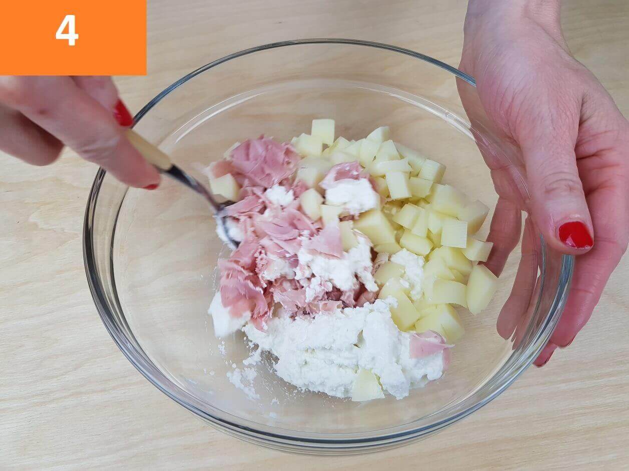 Passaggi 1 / 2 / 3) Per preparare i fiori di zucca ripieni procedete con la pulizia dei fiori. Pulite i fiori di zucca tamponandoli con un panno umido. Aprite i fiori di zucca ed estraete il pistillo centrale. Fatto questo preparate il ripieno riunite in una terrina la ricotta, il prosciutto a pezzetti e la scamorza tagliata a cubetti molto piccoli.