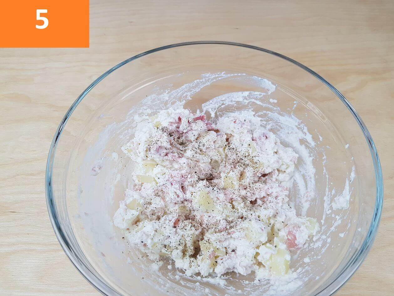 Passaggi 4 / 5 / 6) Mescolate per amalgamare gli ingredienti, poi aggiungete un pizzico di pepe e amalgamate ancora. Prendete i fiori di zucca , uno alla volta e aiutandovi con un cucchiaino mettete il ripieno al loro interno. Chiudete un pò verso i petali e sistemateli in una pirofila con carta forno.