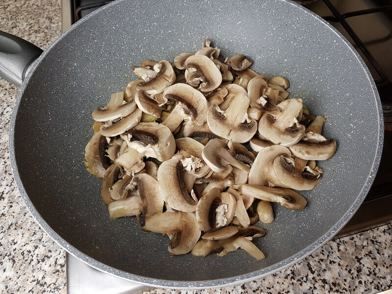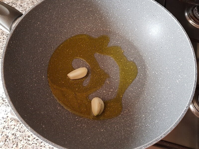 Nel frattempo prendete una padella, versateci l’olio extra vergine di oliva, mettetela nel fuoco a fiamma media, aggiungete il spicchio d’aglio, e i funghi.