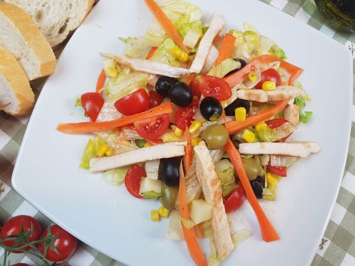 Questa versione di insalata è perfetta per riciclare il pollo grigliato il giorno prima che hai avanzato e messo in frigorifero, io infatti ho fatto proprio così! Ho usato la carne cotta dalla sera prima che avevo in frigo, poi ho aggiunto le verdure di stagione del mio orto. I pomodorini tagliati a spicchi, carote fresche tagliate a striscioline, insalata, mais, olive e provola a pezzetti, ho ottenuto cosi un piatto completo, semplice leggero e molto gustoso. Ingredienti freschi e di stagione, colorati che soddisfano tanto il palato quanto alla vista, ti permetterà di realizzare una delle insalate più buone che hai mai gustato.