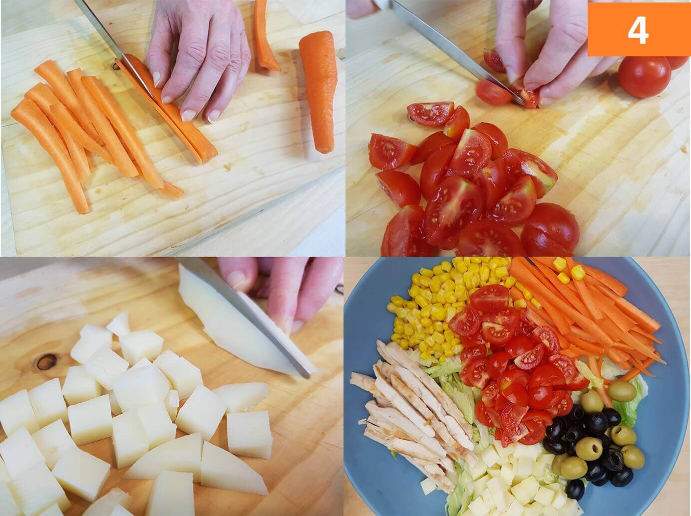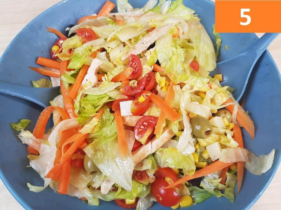 Passaggi 4 / 5 /) In una ciotola riunite l’insalata ben sgocciolata, le carote tagliate a striscioline, i pomodorini tagliati a metà, le olive, il mais sgocciolato, la provola a pezzetti ed in fine il pollo, condite con un pò di succo di limone, olio, sale e pepe, poi mescolate bene.