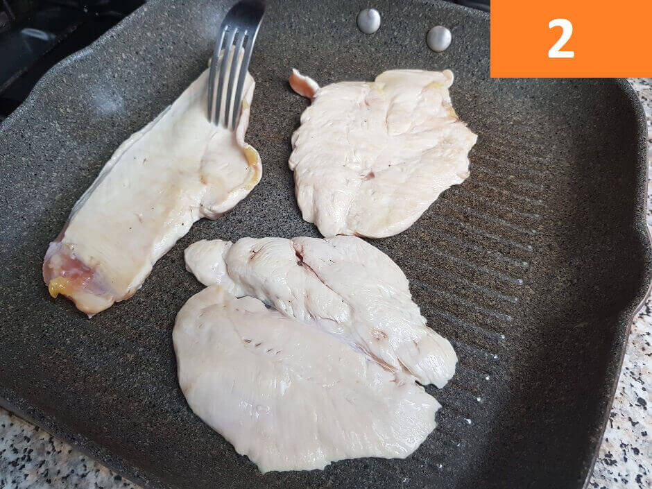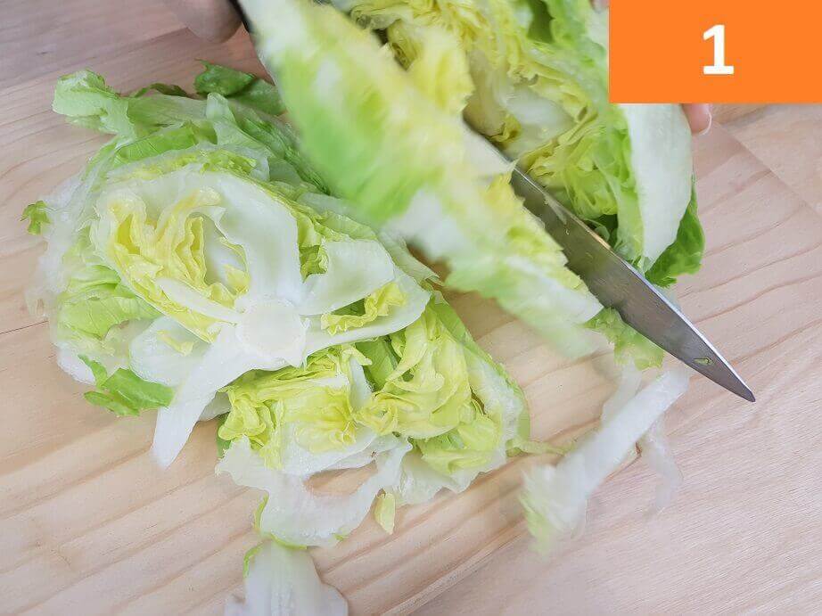 Passaggi 1 / 2 / 3) Per iniziare a preparare l’insalata di pollo iniziate con il pulire l’insalata. Eliminate le foglie esterne, poi tagliate il cespo a fette per ottenere delle striscioline. Tenete in ammollo in acqcua fredda, poi procedete a un paio di risciacqui. Grigliate sulla piastra il petto di pollo, una volta freddato tagliatelo a listarelle.