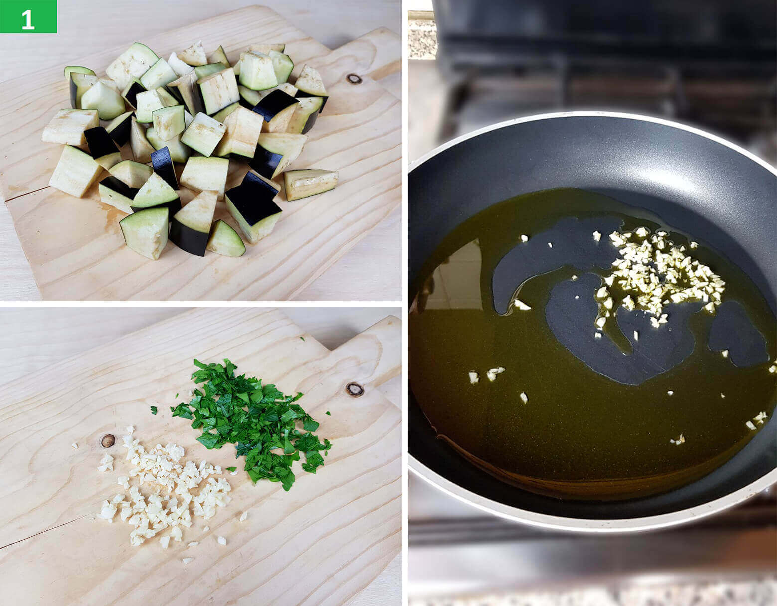 Passaggio 1 ) Per preparare le melanzane a funghetto, iniziate a lavare le melanzane, eliminate l’estremità del peduncolo e la parte finale e tagliatele a cubetti. Pulite l’aglio e il prezzemolo e tritateli finemente. In una padella versate l’olio extra vergine di oliva e fate soffriggere.