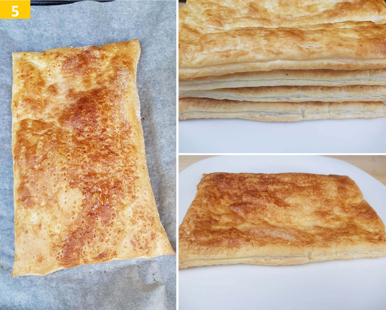 Passaggio 7 )  Assemblate ora la millefoglie. Mettete la prima sfoglia su un piatto da portata. Ricoprite la superfice con la crema diplomatica. Alternate le sfoglie con la crema diplomatica e terminate con lo strato di sfoglia. Decorate la vostra millefoglie con zucchero a velo, quindi mettete in frigo per un’ora prima di portare il dolce in tavola.