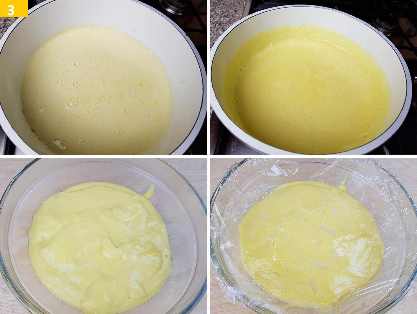 Passaggio  3 ) Trasferite il composto nel tegame e fate addensare sul fuoco e mescolate fino ad ottenere una crema liscia e della densità che preferite. Mettete la crema in una ciotola, copritela con della pellicola trasparente a contatto e fatela raffreddare.