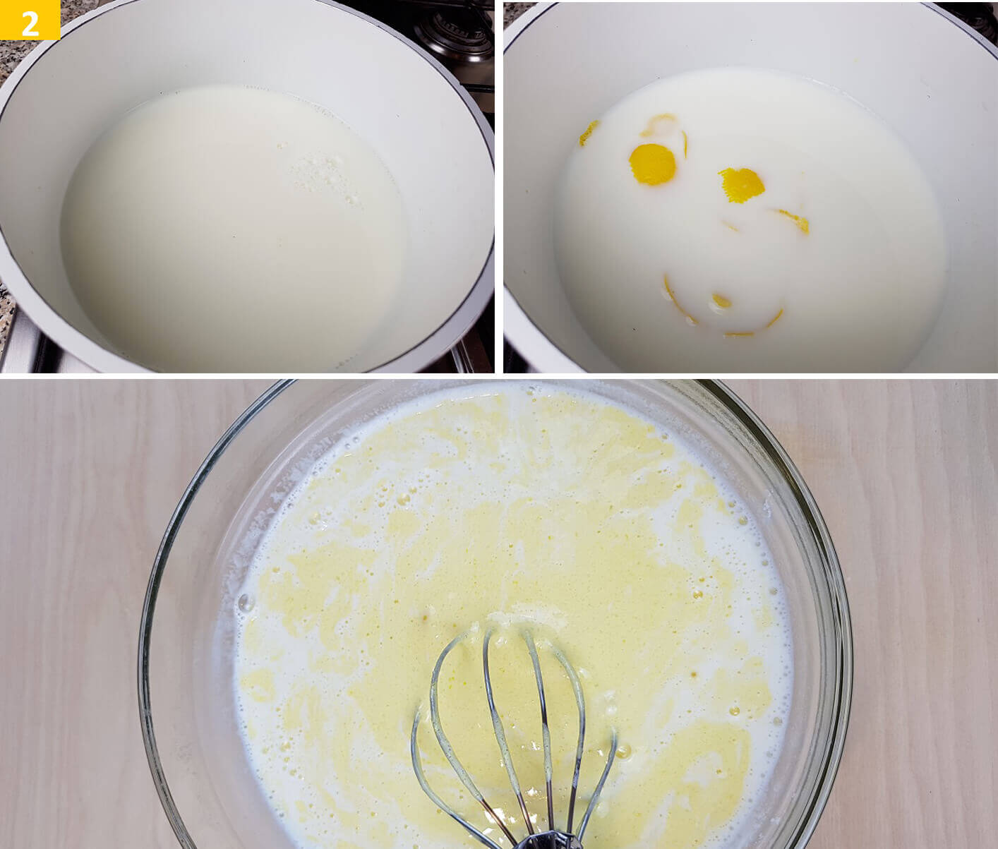 Passaggio 2 ) In un tegame versate il latte e la buccia di un limone. Fate Sobbollire a fiamma bassa per 5 minuti, togliete la buccia del limone e versate il latte a filo nel composto. Quindi mescolate.