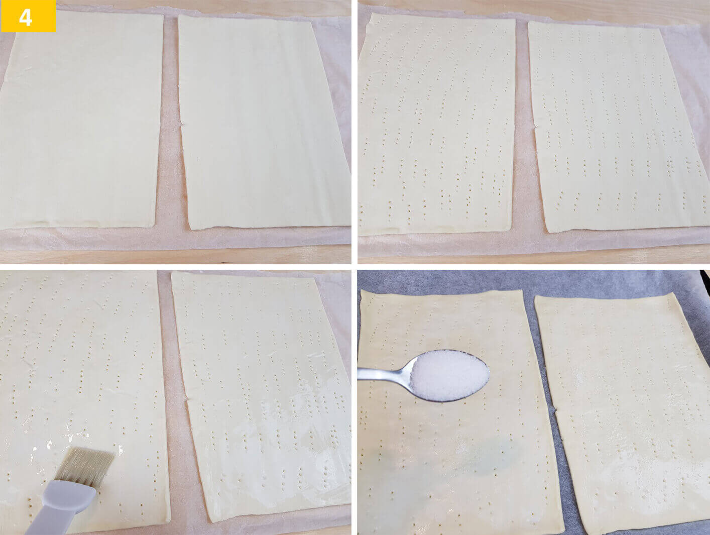 Passaggio 4 ) Nel frattempo preparate le sfoglie. Stendete la pasta sfoglia su un piano e ritagliate 4 rettangoli uguali, trasferiteli poi sulle placche da forno rivestite con carta forno. Bucherellate la loro superfice con i rebbi di una forchetta, spennellate con del latte e cospargete di zucchero semolato.