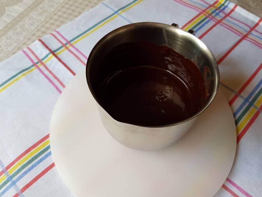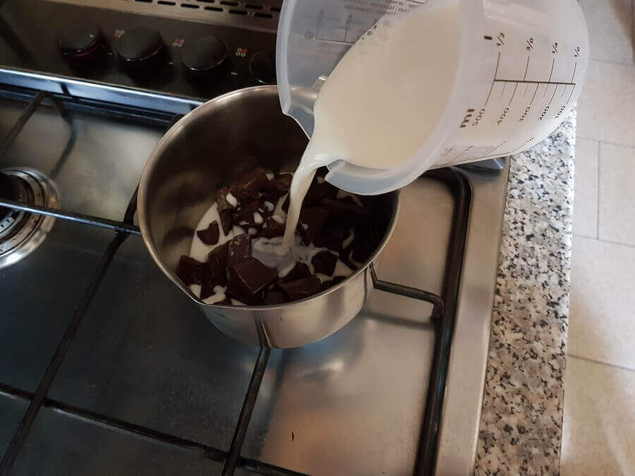 Completata la crema prendere il cioccolato fondente, fatelo a pezzi, mettetelo in un pentolino nel fuoco e aggiungete il latte Q.b per scioglierlo (attenzione a non renderlo troppo liquido).