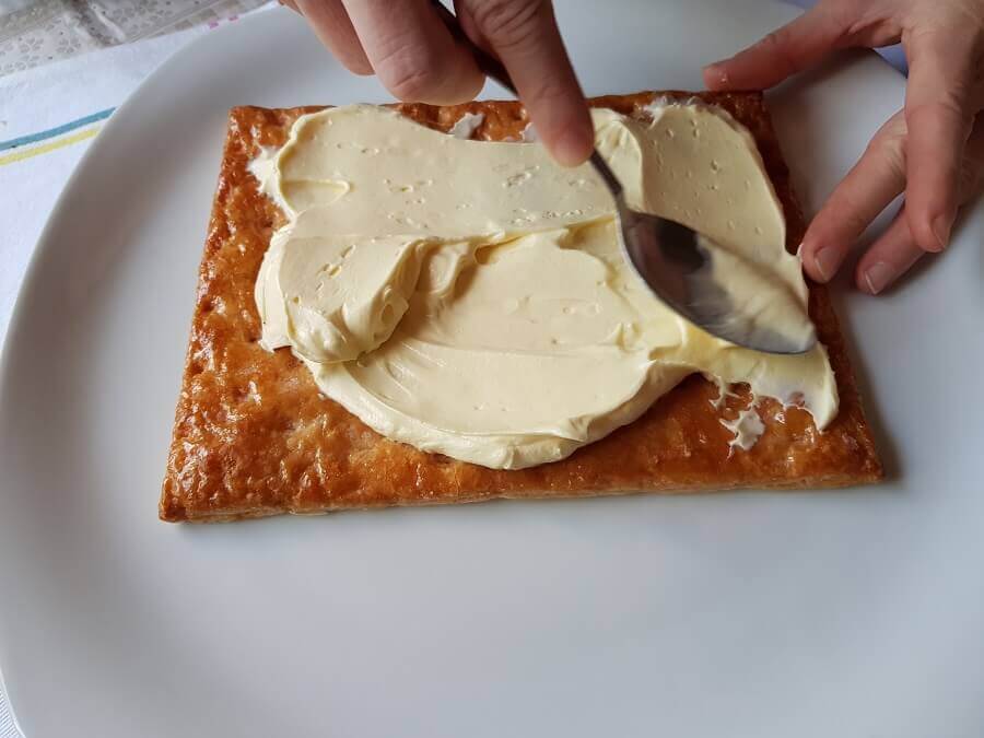 Stendere la crema di mascarpone sopra la sfoglia in modo da creare il primo strato.