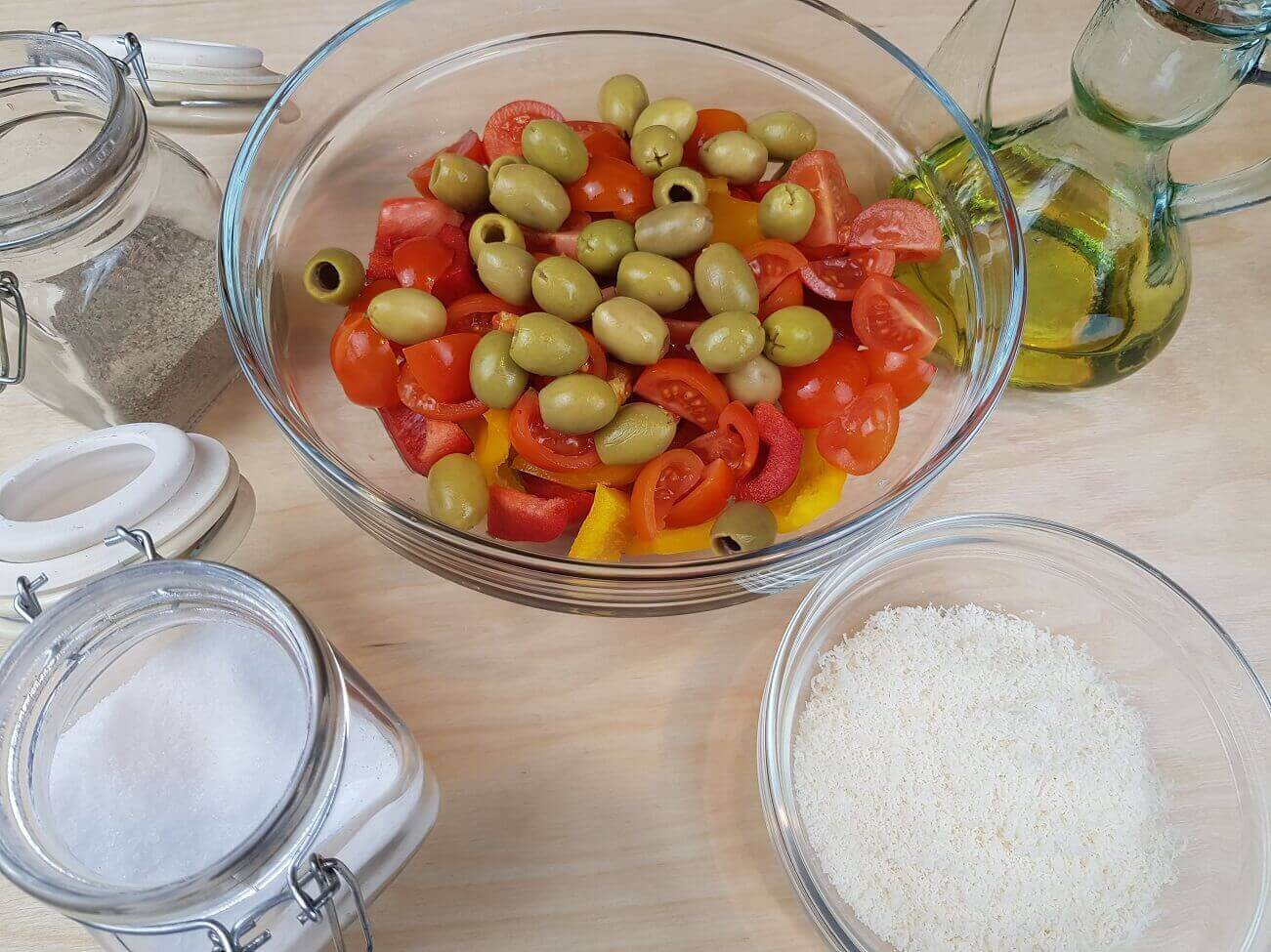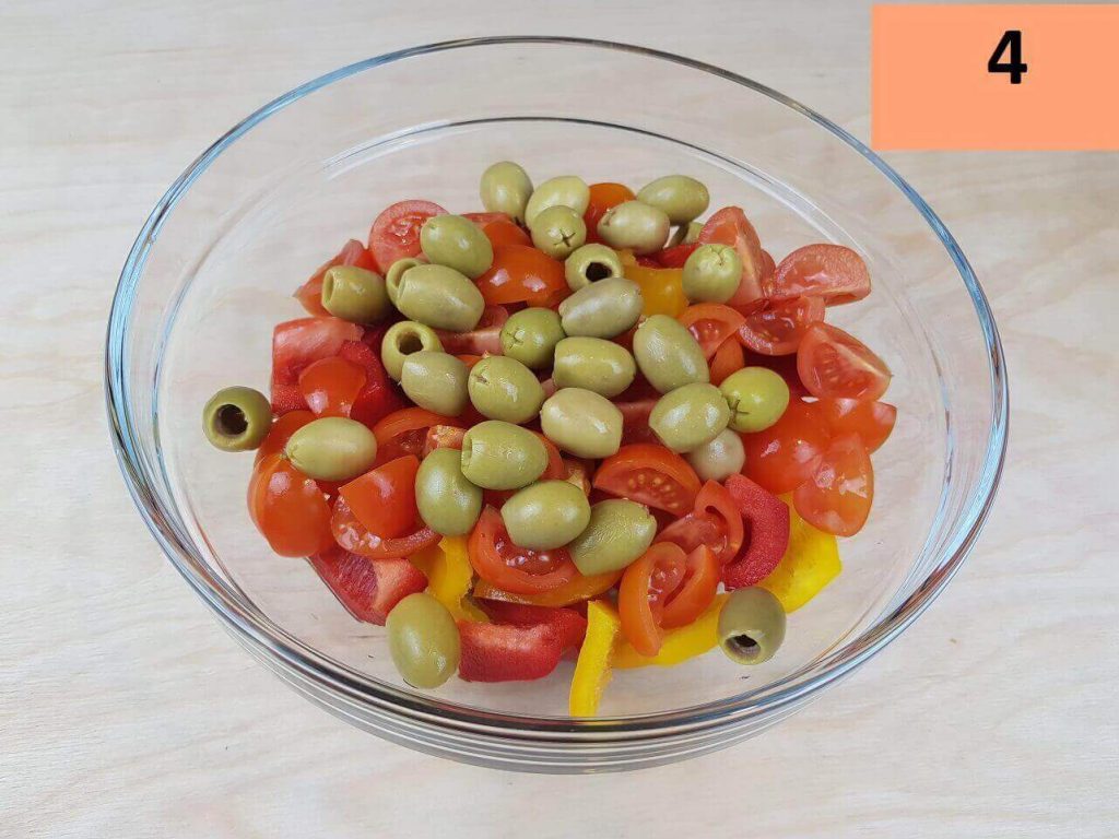 Passaggi 3 / 4) Mettete il tutto in una ciotola capiente. Unite le olive Denocciolate.