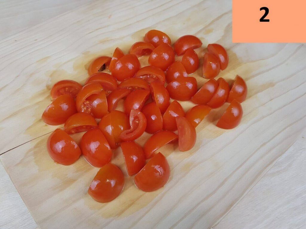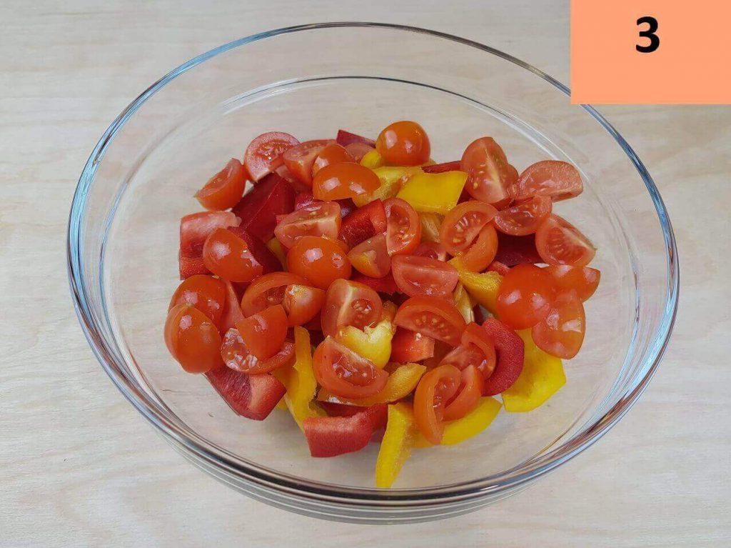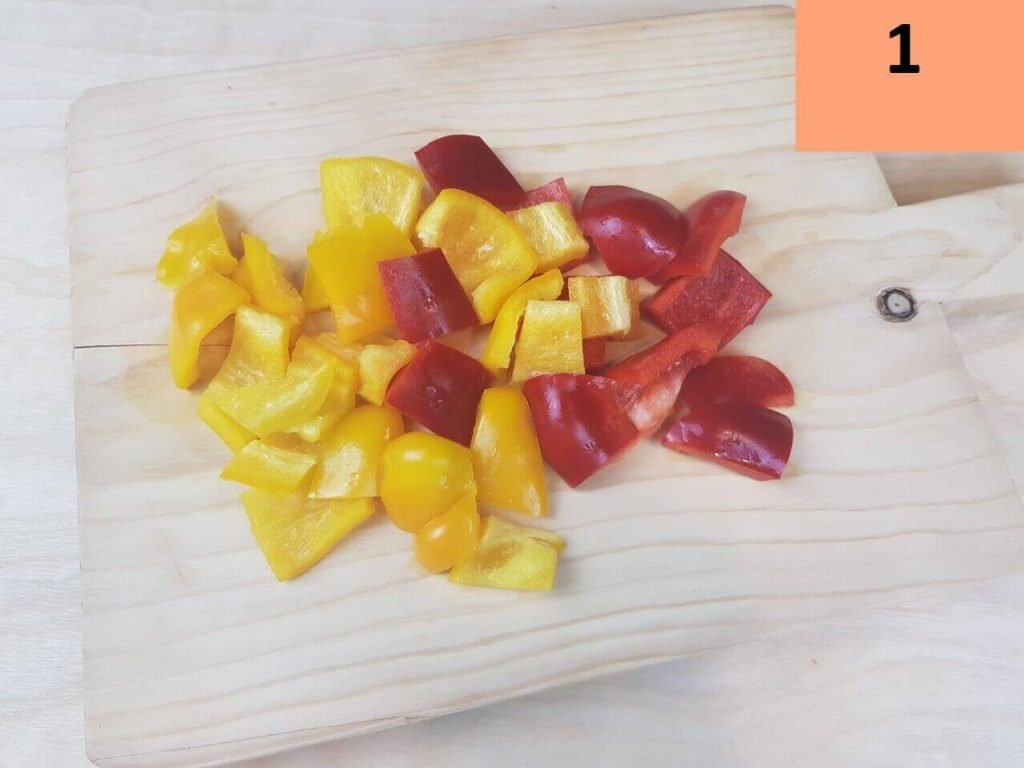 Per prima cosa tagliate i peperoni a pezzetti non troppo piccoli, lo stesso fate con i pomodorini.