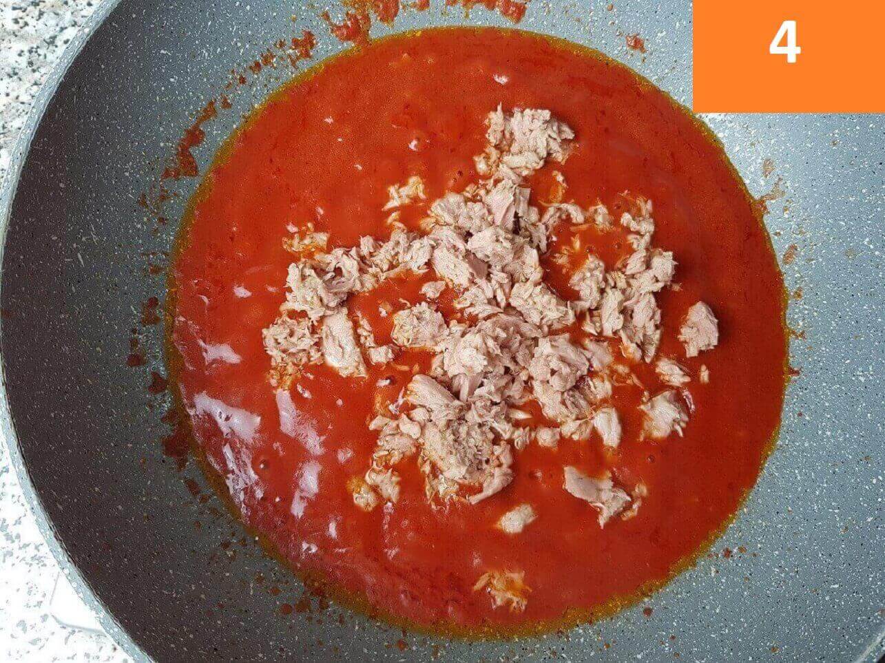 A fine cottura aggiungete il tonno, scolato dall’olio, e lasciate cuocere per 5 minuti, aggiungendo il peperoncino.