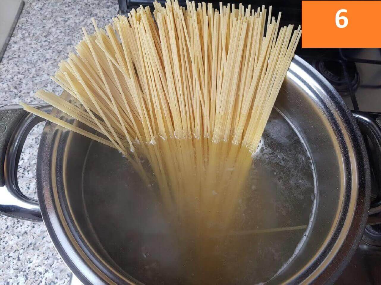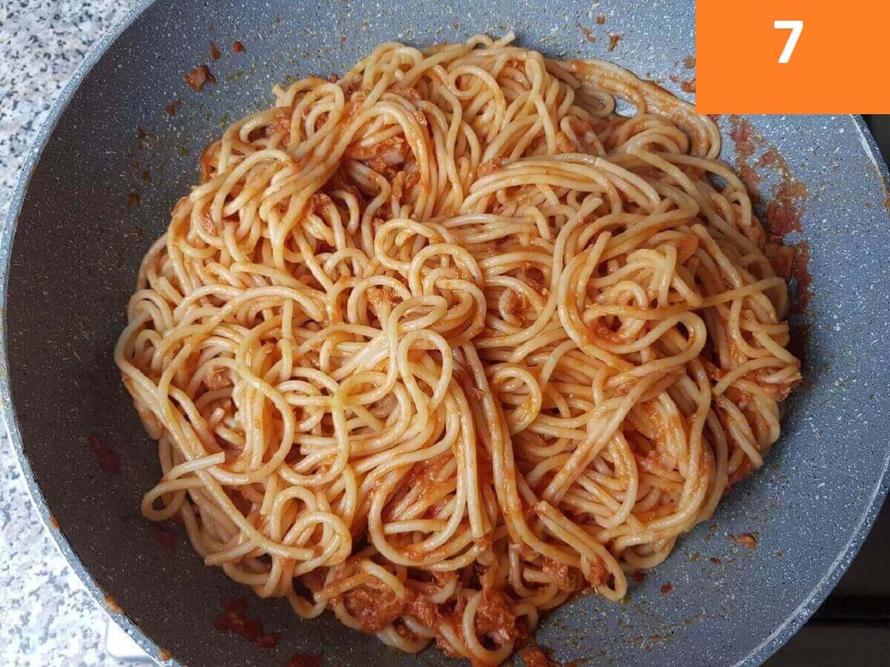 Passaggi 6 / 7) Lessate in acqua salata gli spaghetti e scolateli al dente, amalgamandoli al sugo.