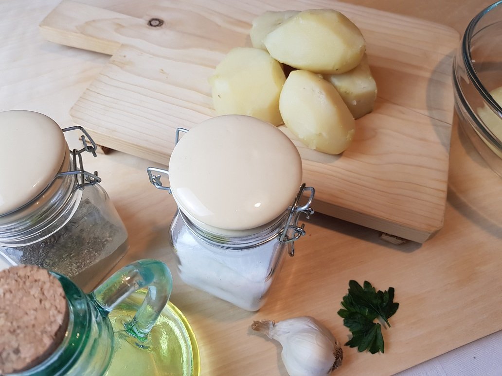 L’ingrediente principale sono le Patate Lessate; vengono lasciate a raffreddare per poi essere successivamente condite con un mix invitante di Aglio e Prezzemolo.
