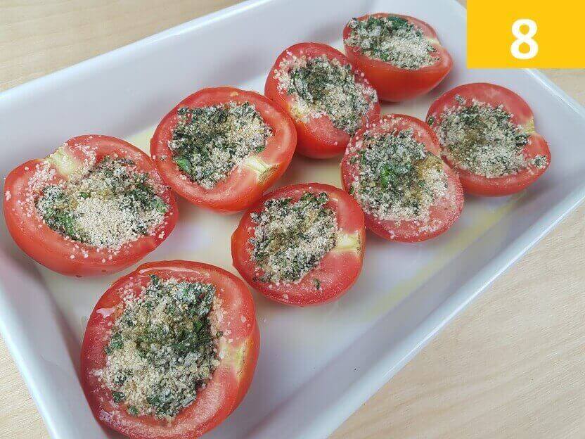 Passaggi 7 / 9 ) Sistemate i pomodori in una pirofila da forno cosparsa con un filo di olio. Poi riempiteli con il trito ottenuto. Irrorate i pomodori con un filo d’olio, quindi cuocete nel forno già caldo a 180 gradi per 20 minuti o fino a quando la superfice dei pomodori sarà dorata.