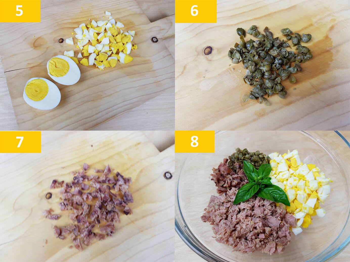 Passaggi 5 / 6 / 7 / 8) In una ciotola, ponete le uova sode tagliate a pezzettini, il tonno sott’Olio sgocciolato, i capperi tritati e le acciughe che vi serviranno per il ripieno dei pomodori.