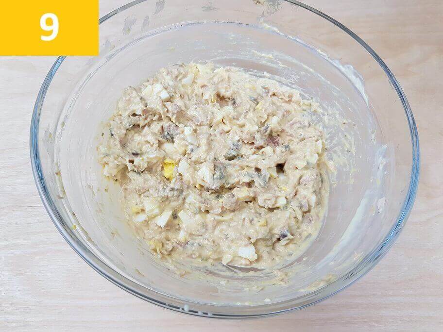 Passaggio 9) Quindi aggiungete la maionese. Mescolate ed amalgamate gli ingredienti fino ad ottenere una crema omogenea.