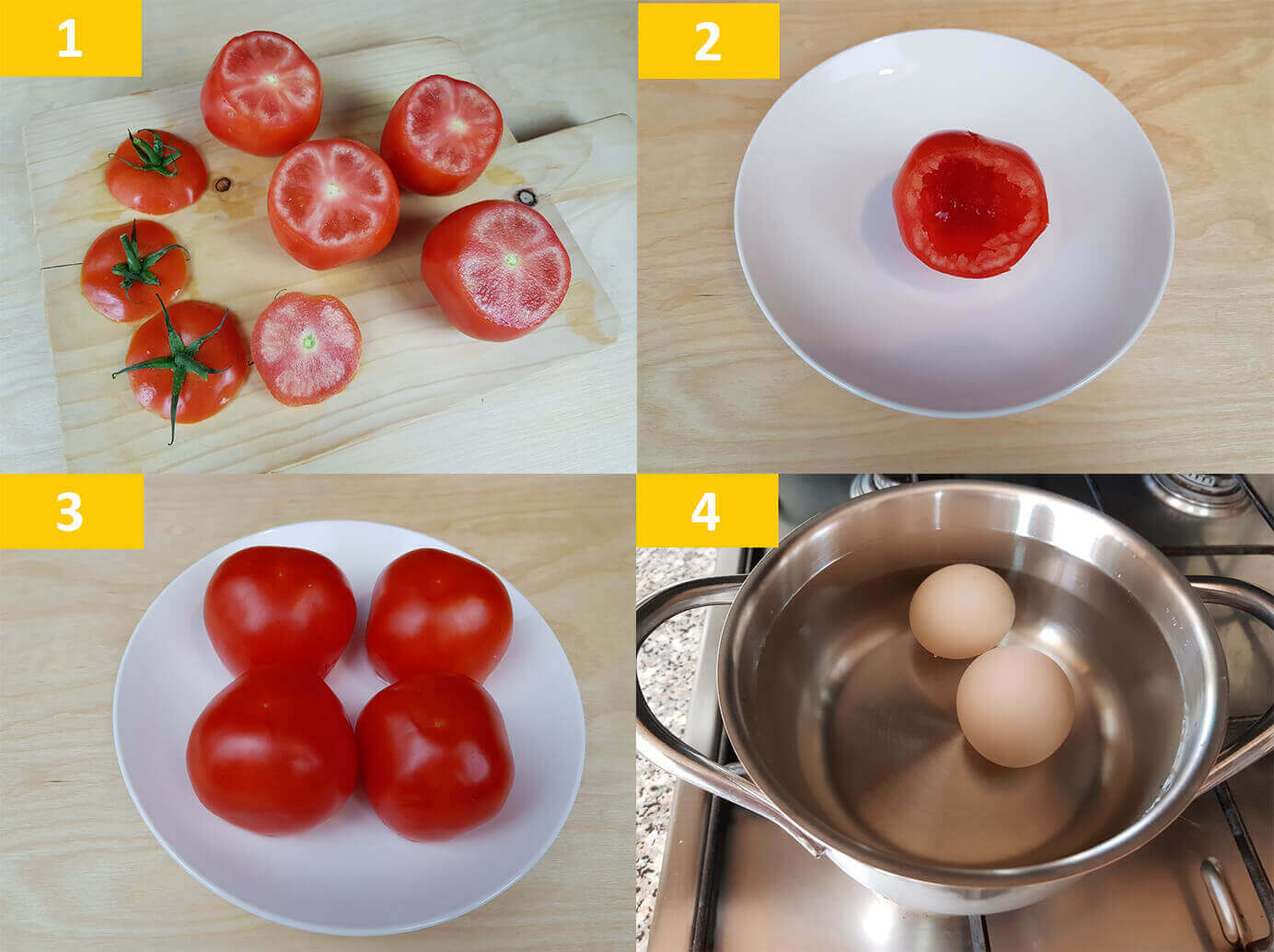 Passaggi 1 / 2 / 3 / 4) Per preparare i pomodori ripieni, per prima cosa lavate i pomodori e tagliate le calotte superiori, stando attenti a non eliminare il picciolo e mettetele da parte. Con l’aiuto di un di un cucchiaino o di uno scavino svuotateli completamente dalla polpa. Salateli leggermente e poneteli su un piatto a sgocciolare capovolti. Nel frattempo rassodate due uova, fatele raffreddare sotto l’acqua fredda corrente, poi sgusciatele.