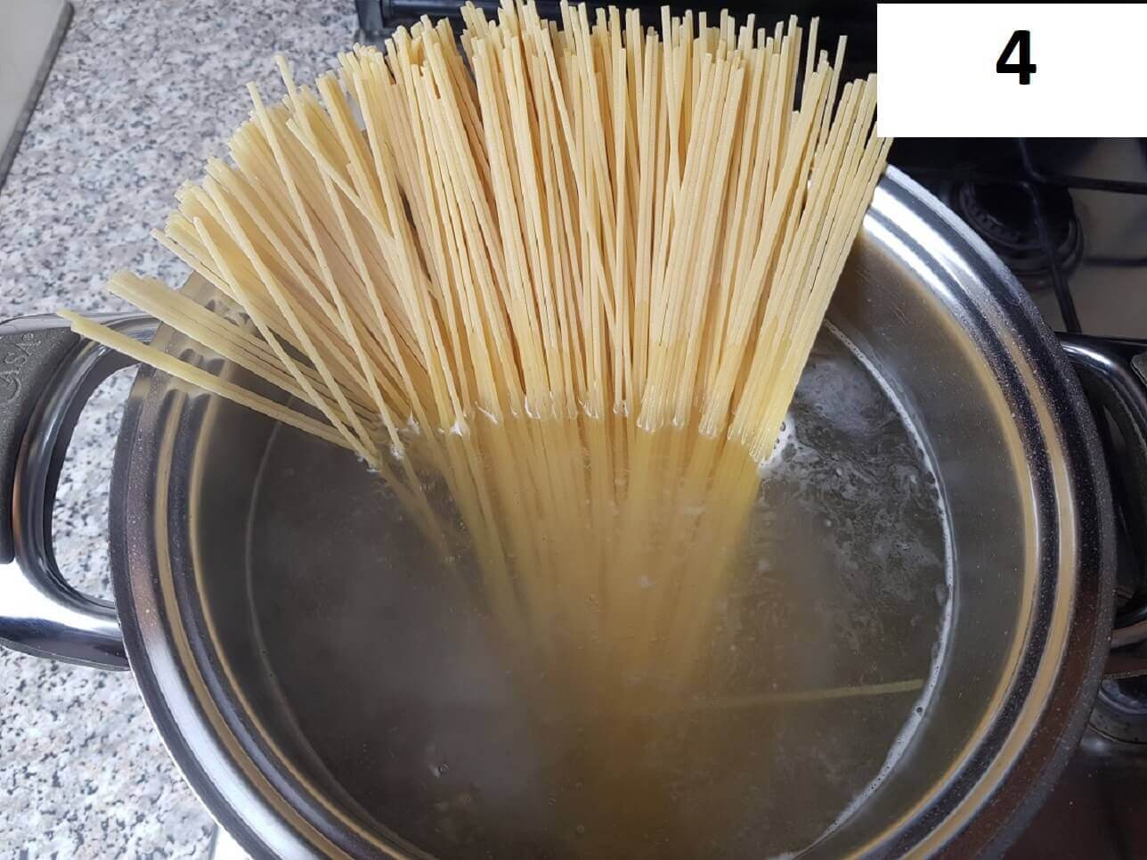 Nel frattempo che il sugo finisce la cottura, in una pentola portate ad ebollizione l’acqua, salatela e tuffateci dentro gli spaghetti.
