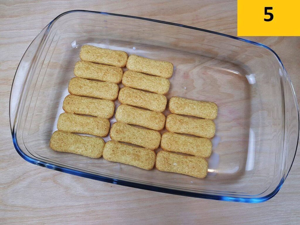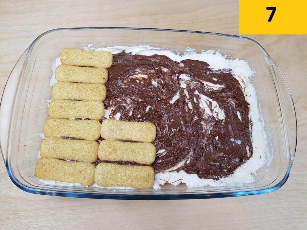 Passaggio 5 / 6 / 7)  A questo punto iniziate a comporre il tiramisù, prendete una pirofila, inzuppate i pavesini nel latte e iniziate a comporre il primo strato di biscotti.  Spalmate il primo strato di crema al cocco, livellatela e con un cucchiaino mettete sopra la nutella.