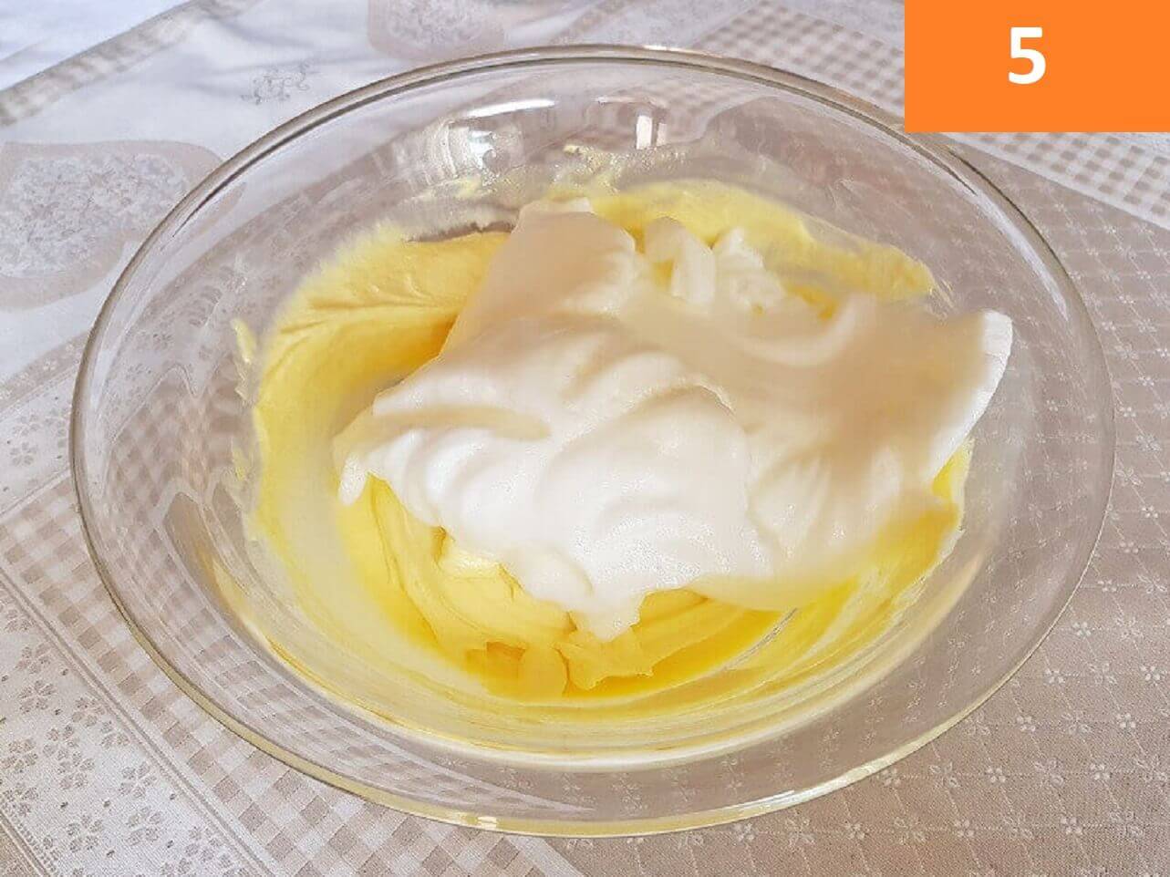 Passaggi 4 / 5 / 6) Unite il mascarpone, e continuate a mescolare energicamente. Infine aggiungete i bianchi a neve precedentemente montati e qualche goccia di limone e continuate a mescolare fino ad ottenere una crema liscia e morbida.