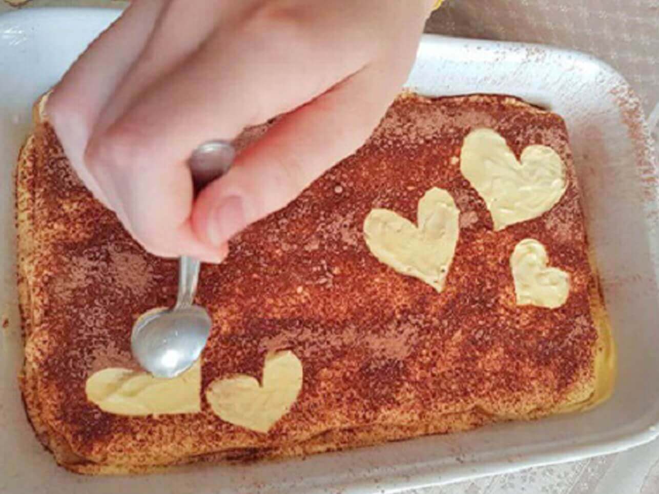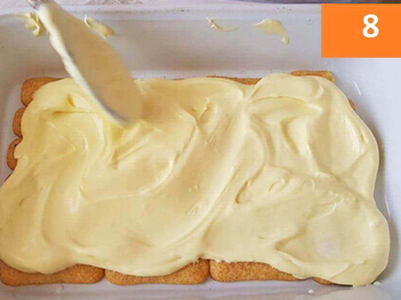Stendere la crema di mascarpone, formare un nuovo strato di pavesini e stendere di nuovo uno strato di crema, così via fino al completamento degli strati.