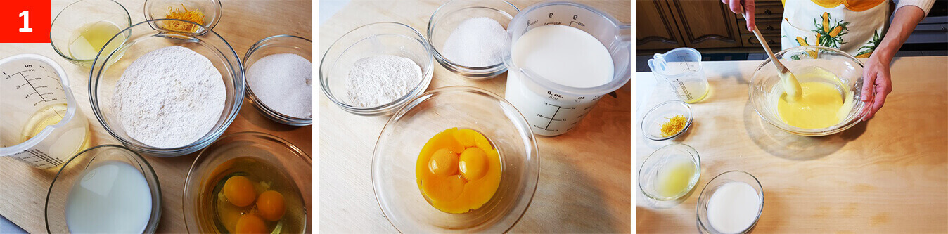 Aggiungeteli poco per volta alle uova e zucchero, e mescolate, poi unite il latte,la buccia grattugiata di un limone all’impasto, e tutto il suo succo all’interno.