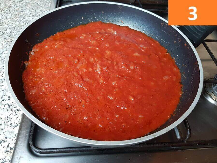 Passaggi 1 / 2 / 3) Per preparare le uova al pomodoro iniziate a tagliare la cipolla a metà, tritatela finemente e fatela appassire in una padella con l’olio extra vergine di oliva a fuoco lento. Aggiungete poi la passata di pomodoro con un pizzico di sale e pepe. Fate cuocere a fuoco dolce per altri 10-15 minuti.