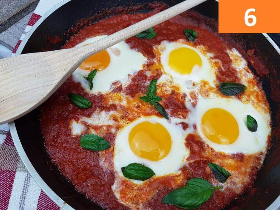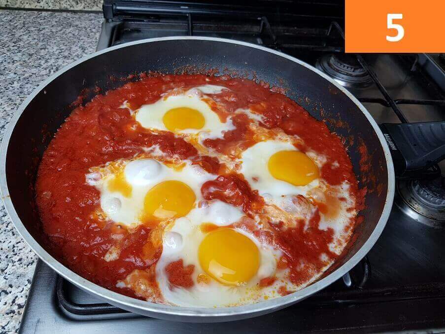 Passaggi 4 / 5 / 6) A questo punto aggiungete le uova, create degli spazi nel pomodoro una sorta di nido nel quale adagiare le uova. Fate cuocere tra i 7 e i 12 minuti, i tempi variano in base a come desiderate la cottura del tuorlo. Perchè siano cotte basterà che l’albume diventi bianco.