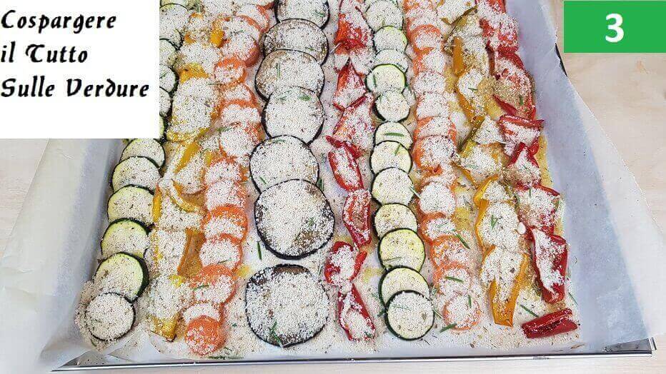 Passaggio 3) Trascorsi i 40 minuti estraete la teglia dal forno e cospargete questo trito sulle verdure in modo uniforme. Infornate nuovamente per altri 10 minuti poi azionate il grill per 2-3 minuti o fino a che le verdure non saranno ben gratinate.