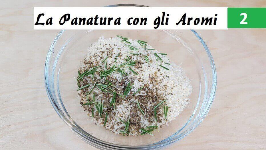Passaggio 2) Nel frattempo preparate la panatura, in una ciotola mettete il pangrattato, il parmigiano grattugiato, il rosmarino, l’origano e mescolate.