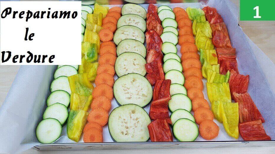 Passaggio 1 ) Per preparare le verdure gratinate al forno per prima cosa, lavate le zucchine privatele dalle estremità e tagliatele a rondelle. Fate lo stesso procedimento con la melanzana. Lavate i peperoni, tagliateli a metà, eliminate i filamenti e i semi interni e tagliateli a pezzi di media grandezza. Lavate ora le carote, pelatele e tagliatele a rondelle. Foderate la teglia da forno con carta forno, sistemate le verdure all’interno leggermente sovrapposte. Aggiustate di sale, pepe e aggiungete un filo d’olio. Mettete la teglia di verdure al forno a 180 gradi per 40 minuti.